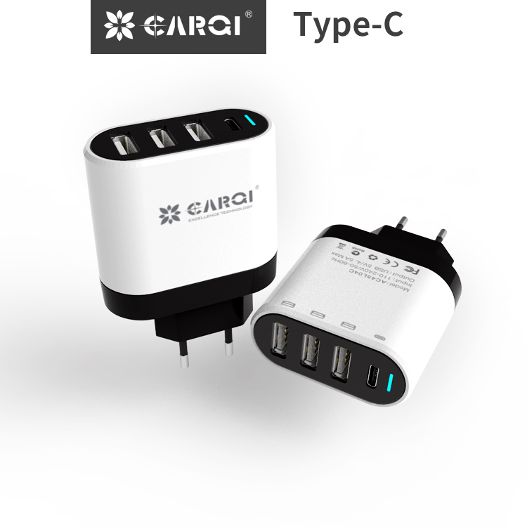 名称:Type-C+3USB欧规旅行充电器(直充,墙充,充电头) 型号:AC45l04C-EU 端口:Type-C+3USB 输入:100-240V 输出:5V/4500mA 定制颜色:黑+白,黑色,红色,红+黑(可定制) 默认颜色:黑+白 尺寸:L61.75×59.5×28.75mm